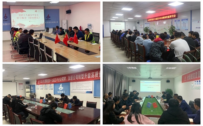 公司所属各分支机构党支部及时组织全体党员干群通过“三会一课”、党员活动日、“学习强国”平台、制作宣传展板、现场悬挂条幅等多种形式,全面学习宣传贯彻党的十九届五中全会精神,营造良好学习氛围,推进大干快上超产,力争超额完成全年目标任务。